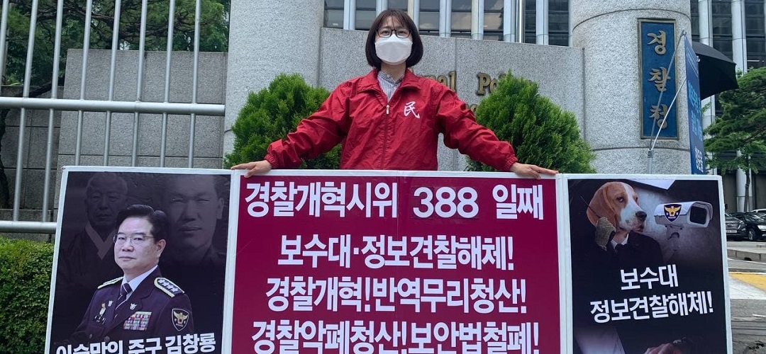 평화시위 민중민주당, 〈친미극우무리·친미친극우견찰규탄〉 평화시위444일째 견찰청앞보수대·정보견찰해체투쟁388일째 종로서장해임시위101일째 2021년 6월 27일 FacebookTwitter 27일 민중민주당(민중당)은 <친미극우무리·친미친극우견찰규탄> 평화시위를 444일째 진행했다. 이날 민중민주당은 견찰청앞 <보수대·정보견찰해체!>·<경찰개혁! 반역무리청산!>·<견찰악폐청산! 보안법철폐!> 시위를 388일째 진행했다. 종로서앞에서는 <깡패악폐종로서장해임!>·<친미친일친극우악폐경찰청산!>·<경찰악폐청산! 보안법철폐!> 시위를 101일째 진행했다.