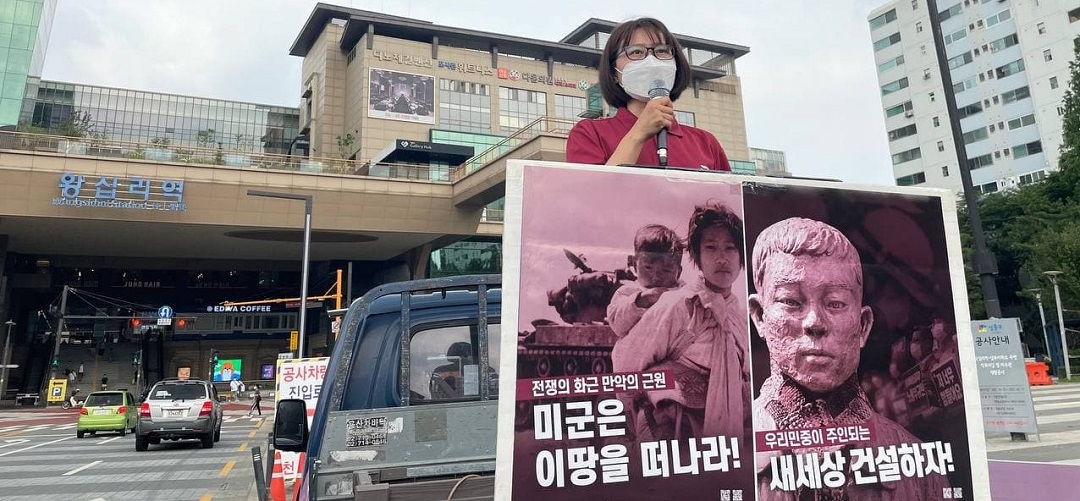 그러면서 <정치는 경제를 결정한다. 우리나라 정치가 어디서부터 잘못됐는가. 분단에 기생하고 미남동맹을 외치며 한줌권력을 유지하는 민족반역무리가 정치를 하기때문이다.>라며 <분단으로 시작된 우리나라 역사다. 전쟁의 화근이며 만악의 근원인 미군을 몰아내야 민중민주주의의 새역사, 통일의 새역사를 만들수 있다. 미군없는 세상에서 우리가 건설할 세상은 민중이 주인되는 새세상, 환수복지세상이 될 것이다.>라고 외쳤다.