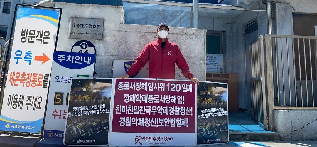 평화시위 민중민주당 〈친미극우무리·친미친극우견찰규탄〉 평화시위463일째 견찰청앞보수대·정보견찰해체투쟁407일째 종로서장해임시위120일째 2021년 7월 16일 FacebookTwitter 16일 민중민주당(민중당)은 <친미극우무리·친미친극우견찰규탄> 평화시위를 463일째 진행했다. 이날 민중민주당은 견찰청앞 <보수대·정보견찰해체!>·<경찰개혁! 반역무리청산!>·<견찰악폐청산! 보안법철폐!> 시위를 407일째 진행했다. 종로서앞에서는 <깡패악폐종로서장해임!>·<친미친일친극우악폐경찰청산!>·<경찰악폐청산! 보안법철폐!> 시위를 120일째 진행했다.