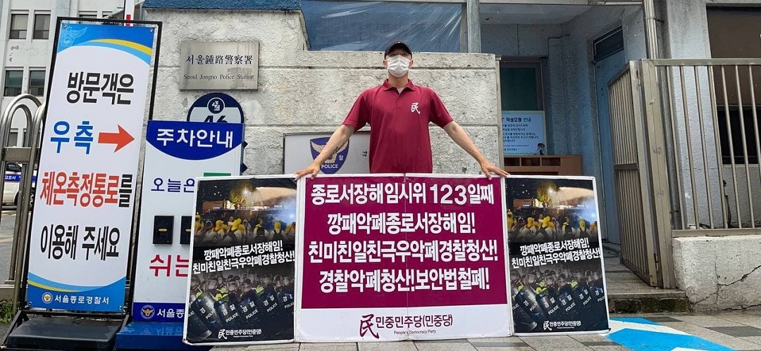 평화시위 민중민주당 〈친미극우무리·친미친극우견찰규탄〉 평화시위466일째 견찰청앞보수대·정보견찰해체투쟁410일째 종로서장해임시위123일째 2021년 7월 20일 FacebookTwitter 19일 민중민주당(민중당)은 <친미극우무리·친미친극우견찰규탄> 평화시위를 466일째 진행했다. 이날 민중민주당은 견찰청앞 <보수대·정보견찰해체!>·<경찰개혁! 반역무리청산!>·<견찰악폐청산! 보안법철폐!> 시위를 410일째 진행했다. 종로서앞에서는 <깡패악폐종로서장해임!>·<친미친일친극우악폐경찰청산!>·<경찰악폐청산! 보안법철폐!> 시위를 123일째 진행했다.