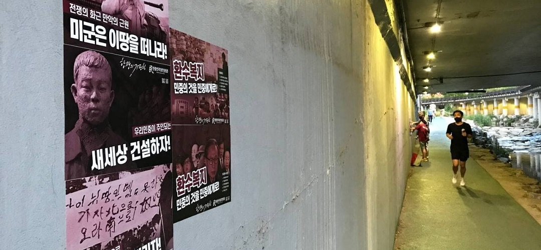 신림역근처 도림천수변공원에는 <전쟁의 화근 만악의 근원 미군은 이땅을 떠나라!>, <우리민중이 주인되는 새세상 건설하자!>, <우리민족의 힘으로 조국통일 앞당기자!>, <환수복지, 민중의 것을 민중에게로!> 구호가 적힌 포스터와 스티커를 부착했다.