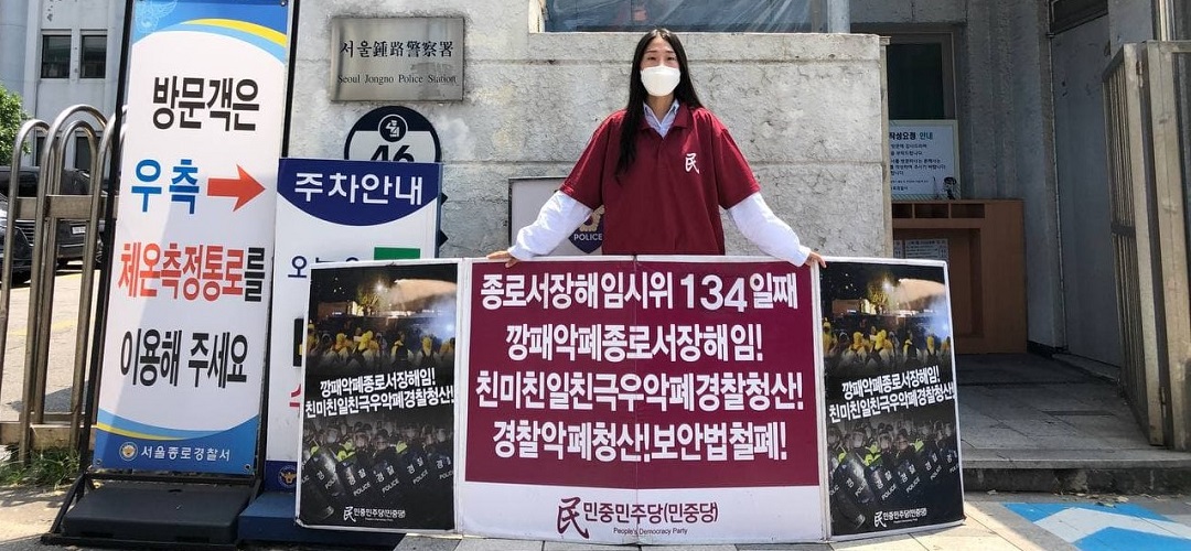 평화시위 민중민주당 〈친미극우무리·친미친극우견찰규탄〉 평화시위477일째 견찰청앞보수대·정보견찰해체투쟁421일째 종로서장해임시위134일째 2021년 7월 30일 FacebookTwitter 30일 민중민주당(민중당)은 <친미극우무리·친미친극우견찰규탄> 평화시위를 477일째 진행했다. 이날 민중민주당은 견찰청앞 <보수대·정보견찰해체!>·<경찰개혁! 반역무리청산!>·<견찰악폐청산! 보안법철폐!> 시위를 421일째 진행했다. 종로서앞에서는 <깡패악폐종로서장해임!>·<친미친일친극우악폐경찰청산!>·<경찰악폐청산! 보안법철폐!> 시위를 134일째 진행했다.