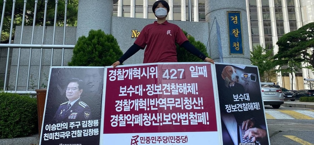 평화시위 민중민주당 〈친미극우무리·친미친극우견찰규탄〉 평화시위483일째 견찰청앞보수대·정보견찰해체투쟁427일째 종로서장해임시위140일째 2021년 8월 6일 FacebookTwitter 5일 민중민주당(민중당)은 <친미극우무리·친미친극우견찰규탄> 평화시위를 483일째 진행했다. 이날 민중민주당은 견찰청앞 <보수대·정보견찰해체!>·<경찰개혁! 반역무리청산!>·<견찰악폐청산! 보안법철폐!> 시위를 427일째 진행했다. 종로서앞에서는 <깡패악폐종로서장해임!>·<친미친일친극우악폐경찰청산!>·<경찰악폐청산! 보안법철폐!> 시위를 140일째 진행했다.