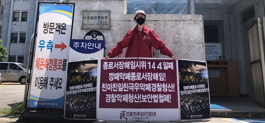 평화시위 민중민주당 〈친미극우무리·친미친극우견찰규탄〉 평화시위487일째 견찰청앞보수대·정보견찰해체투쟁431일째 종로서장해임시위144일째 2021년 8월 10일 FacebookTwitter 9일 민중민주당(민중당)은 <친미극우무리·친미친극우견찰규탄> 평화시위를 487일째 진행했다. 이날 민중민주당은 견찰청앞 <보수대·정보견찰해체!>·<경찰개혁! 반역무리청산!>·<견찰악폐청산! 보안법철폐!> 시위를 431일째 진행했다. 종로서앞에서는 <깡패악폐종로서장해임!>·<친미친일친극우악폐경찰청산!>·<경찰악폐청산! 보안법철폐!> 시위를 144일째 진행했다.
