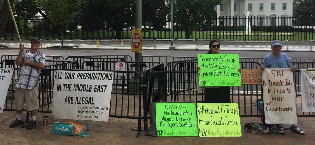 민중민주당(민중당) 미국평화원정단은 17일(현지시간) 워싱턴D.C 백악관앞에서 <제국주의침략군대 미군철거!>, <북침전쟁연습 영구중단!>, <대북적대정책 완전폐기!>, <굴욕적인 미일남동맹 해체!>, <쿠바 내정간섭 즉각 중단!>을 촉구하는 평화시위를 총1551일째 진행했다.