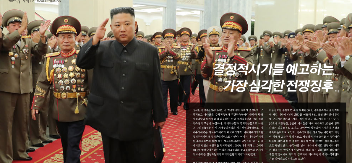 2019.1당총비서, 2020.1당중앙위, 2021.1당대회의 이름으로 발표된 <새로운길>이 <또다른길>로 바뀌지않는한 <충격적인실제행동>으로 넘어가는 <정면돌파전>은 의연히 그대로일수밖에 없다. 작년과 금년의 6.4보천보전투기념일에 각각 김정은위원장대리인 김여정당시1부부장의 담화, 김정은위원장주재 정치국회의를 통해 시작돼 작년엔 당통일전선부에서 군총참모부로 대적행동행사권을 넘기고 금년엔 군총참모부가 <야간기동훈련>등 명령을 내리고 당중앙군사위가 <고도의격동태세>를 요구했다. 또 70여년군건설역사에 처음있는 1차지휘관·정치일군강습회는 전대미문의 사업·사건을 앞두고 진행된 전대미문의 교양·설명이라고 봐도 무방하다. 과연 이보다 심각한 전쟁징후가 있었던가. 정세는 분명 결정적시기를 향하고있다.
