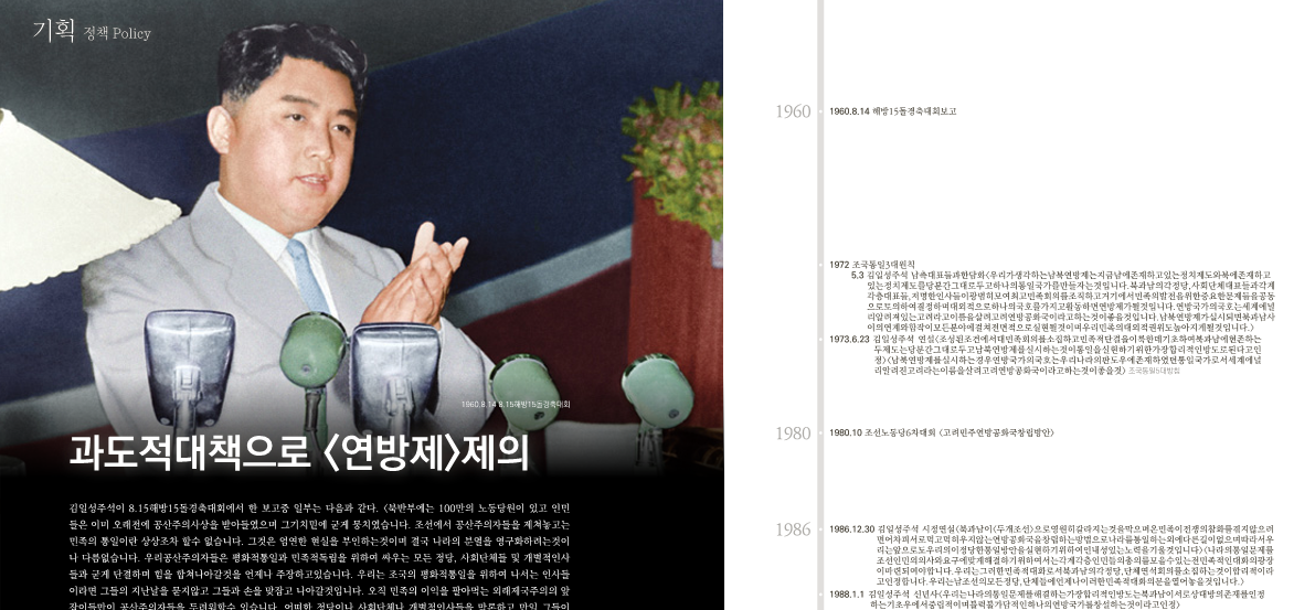 김일성주석이 8.15해방15돌경축대회에서 한 보고중 일부는 다음과 같다. <북반부에는 100만의 노동당원이 있고 인민들은 이미 오래전에 공산주의사상을 받아들였으며 그기치밑에 굳게 뭉치였습니다. 조선에서 공산주의자들을 제쳐놓고는 민족의 통일이란 상상조차 할수 없습니다. 그것은 엄연한 현실을 부인하는것이며 결국 나라의 분열을 영구화하려는것이나 다름없습니다. 우리공산주의자들은 평화적통일과 민족적독립을 위하여 싸우는 모든 정당, 사회단체들 및 개별적인사들과 굳게 단결하며 힘을 합쳐나아갈것을 언제나 주장하고있습니다. 우리는 조국의 평화적통일을 위하여 나서는 인사들이라면 그들의 지난날을 묻지않고 그들과 손을 맞잡고 나아갈것입니다. 오직 민족의 이익을 팔아먹는 외래제국주의의 앞잡이들만이 공산주의자들을 두려워할수 있습니다. 어떠한 정당이나 사회단체나 개별적인사들을 막론하고 만일 그들이 진정으로 민족의 운명을 우려하고 평화적통일을 바란다면 결코 <용공>을 반대할수 없을것이며 남북자유선거를 거부할수는 없는것입니다. 어떠한 외국의 간섭도 없이 민주주의적기초위에서 자유로운 남북총선을 실시하는것이 평화적조국통일의 가장 합리적이고 현실적인 길이라는것은 논박할 여지가 없습니다. 우리는 남조선의 모든 정당, 사회단체들과 각계각층 인민들에게 이러한 선거의 실시를 위하여 나설것을 호소합니다. 만일 그래도 남조선당국이 남조선이 다 공산주의화될까 두려워서 아직은 자유로운 남북총선거를 받아들일수 없다고 하면 먼저 민족적으로 긴급하게 나서는 문제부터 해결하기 위하여 과도적인 대책이라도 세워야할것입니다. 우리는 이러한 대책으로서 남북조선의 연방제를 실시할것을 제의합니다. 우리가 말하는 연방제는 당분간 남북조선의 현재 정치제도를 그대로 두고 조선민주주의인민공화국정부와 <대한민국>정부의 독자적인 활동을 보존하면서 동시에 두정부의 대표들로 구성되는 최고민족위원회를 조직하여 주로 남북조선의 경제·문화발전을 통일적으로 조절하는 방법으로 실시하자는것입니다. 이러한 연방제의 실시는 남북의 접촉과 협상을 보장함으로써 호상이해와 협조를 가능하게 할것이며 호상간의 불신임도 없애게 될것입니다. 그렇게 되었을때에 자유로운 남북총선거를 실시한다면 조국의 완전한 평화적통일을 실현할수 있으리라고 우리는 인정합니다. 특히 이러한 연방제의 실시는 비록 각계각층을 망라하는 통일적인 연합정부가 못되어서 통일적인 국가적지도는 못하더라도 이연방의 최고민족위원회에서 전민족에 이로운 경제·문화적문제를 협의하며 남·북조선의 경제·문화교류와 호상협조를 보장함으로써 남조선의 경제적파국을 수습할수 있게 할것입니다.>