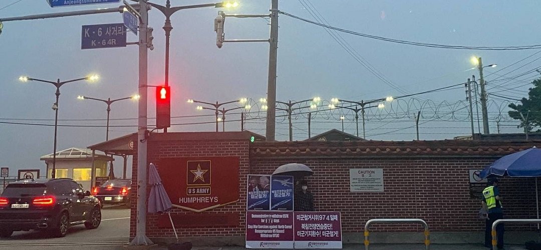 주남미군사령부가 있는 평택험프리스기지앞에서는 <북침전쟁연습중단! 미군기지환수! 미군철거!> 구호피시를 들고 미군철거시위를 974일째 진행했다.