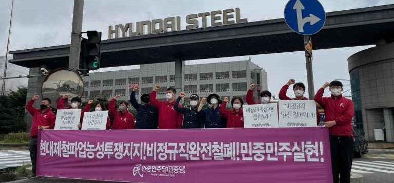 3. 비정규직을 완전히 철폐하고 노동중심사회를 앞당겨야 한다. 비정규직철폐투쟁은 이미 벼랑끝에 내몰릴데로 내몰린 우리노동자·민중이 돌파구를 마련하기 위한 투쟁이다. 현대제철은 동일 사업장에 정규직과 비정규직을 따로 고용하고 정규직·비정규직간 임금격차를 무려 60%까지 낮추면서 <동일노동 동일임금>의 기본원칙을 완전히 파괴하고 있다. 뿐만아니라 노동자들을 정규직·비정규직으로 가르고 자회사설립을 빌미로 비정규직사이를 또다시 이간질하며 노동자들의 노동권·단결권을 완전히 저해하고 있다. 대기업비정규직비율이 2020년기준 최소 40.1%라는 것은 무엇을 말해주는가. 노동자·민중을 분열시키며 노동자·민중의 창조물을 갈취하는 재벌·대기업의 만행은 비단 현대제철에서만 이루어지는 것이 아니다. 노동자·민중의 단결투쟁만이 노동자·민중의 운명을 개척할 수 있다. 세상을 바꾸고 시대를 선도해온 우리노동자·민중은 단결된 힘으로 억압과 착취의 사슬을 분쇄하고 민중민주의 참세상을 앞당길 것이다.