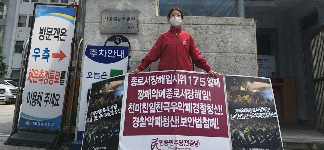 평화시위 민중민주당 〈친미극우무리·친미친극우견찰규탄〉 평화시위518일째 견찰청앞보수대·정보견찰해체투쟁462일째 종로서장해임시위175일째 2021년 9월 10일 FacebookTwitter 9일 민중민주당(민중당)은 <친미극우무리·친미친극우견찰규탄> 평화시위를 518일째 진행했다. 이날 민중민주당은 견찰청앞 <보수대·정보견찰해체!>·<경찰개혁! 반역무리청산!>·<견찰악폐청산! 보안법철폐!> 시위를 462일째 진행했다. 종로서앞에서는 <깡패악폐종로서장해임!>·<친미친일친극우악폐경찰청산!>·<경찰악폐청산! 보안법철폐!> 시위를 175일째 진행했다.