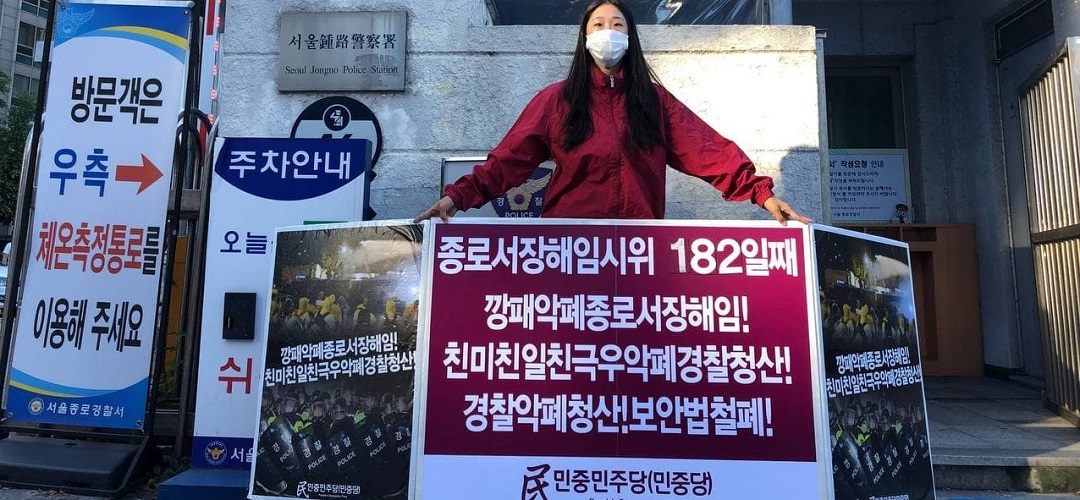 평화시위 민중민주당 〈친미극우무리·친미친극우견찰규탄〉 평화시위525일째 견찰청앞보수대·정보견찰해체투쟁469일째 종로서장해임시위182일째 2021년 9월 16일 FacebookTwitter 16일 민중민주당(민중당)은 <친미극우무리·친미친극우견찰규탄> 평화시위를 525일째 진행했다. 이날 민중민주당은 견찰청앞 <보수대·정보견찰해체!>·<경찰개혁! 반역무리청산!>·<견찰악폐청산! 보안법철폐!> 시위를 469일째 진행했다. 종로서앞에서는 <깡패악폐종로서장해임!>·<친미친일친극우악폐경찰청산!>·<경찰악폐청산! 보안법철폐!> 시위를 182일째 진행했다.
