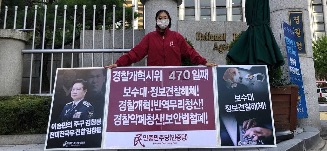 이날 민중민주당은 견찰청앞 <보수대·정보견찰해체!>·<경찰개혁! 반역무리청산!>·<견찰악폐청산! 보안법철폐!> 시위를 470일째 진행했다.