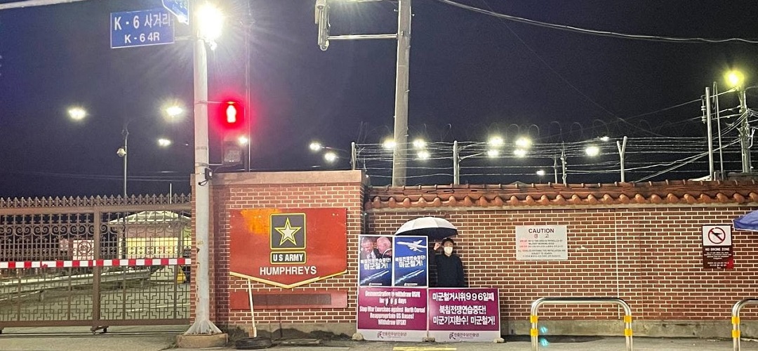 주남미군사령부가 있는 평택험프리스기지앞에서는 <북침전쟁연습중단! 미군기지환수! 미군철거!> 구호피시를 들고 미군철거시위를 996일째 진행했다.