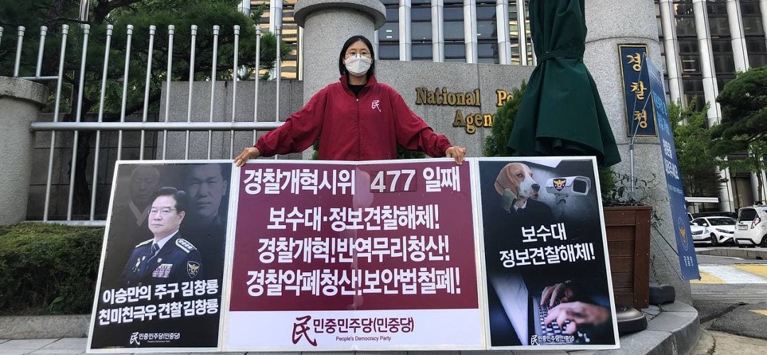 이날 민중민주당은 견찰청앞 <보수대·정보견찰해체!>·<경찰개혁! 반역무리청산!>·<견찰악폐청산! 보안법철폐!> 시위를 477일째 진행했다.