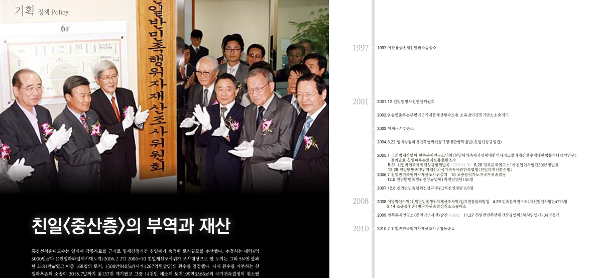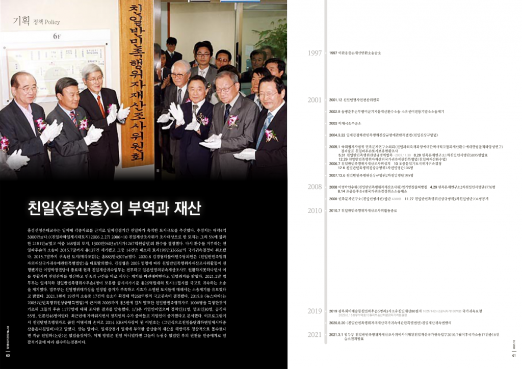 홍경선청운대교수는 일제때 각종자료를 근거로 일제강점기간 친일파가 축적한 토지규모를 추산했다. 추정치는 대략4억3000만㎡다.(<친일파와일제시대토지>2006.2.27) 2006~10 친일재산조사위가 조사대상으로 한 토지는 그의 5%에 불과한 2181만㎡였고 이중 168명의 토지, 1300만9403㎡(시가1267억원상당)의 환수를 결정했다. 다시 환수를 거부하는 친일파후손의 소송이 2015.7말까지 총137건 제기됐고 그중 14건만 패소해 토지199만3366㎡의 국가귀속결정이 취소됐다. 2015.7말까지 귀속된 토지(매각포함)는 총883만4307㎡였다. 2020.8 김경협더불어민주당의원은 <친일반민족행위자의재산국가귀속에관한특별법안>을 대표발의했다. 김경협은 2005 법령에 따라 친일반민족행위자재산조사위활동이 진행됐지만 이명박정권당시 종료돼 현재 친일재산귀속업무는 전무하고 일본인명의귀속재산조사도 원활하지못하다면서 이를 부활시켜 친일잔재를 청산하고 민족의 근간을 바로 세우는 계기를 마련해야한다고 입법취지를 밝혔다. 2021.2말 법무부는 일제치하 친일반민족행위자후손4명이 보유한 공시지가기준 총26억원대의 토지11필지를 국고로 귀속하는 소송을 제기했다. 법무부는 친일행위대가성을 인정할 증거가 부족하고 시효가 소멸된 토지들에 대해서는 소송제기를 유보했다고 밝혔다. 2021.3현재 19건의 소송중 17건의 승소가 확정돼 약260억원의 국고귀속이 결정됐다. 2015.8 <뉴스타파>는 2005<반민족행위진상규명특별법>에 근거해 2009까지 총3번에 걸쳐 발표한 친일반민족행위자로 1006명을 특정한것에 기초해 그들의 후손 1177명에 대해 조사한 결과를 방송했다. 1/3은 기업인이었으며 정치인31명, 법조인30명, 공직자55명, 언론인46명이었다. 최근년에 가까워지면서 정치인의 수가 줄어들고 기업인이 증가했다고 분석했다. 이프로그램에서 친일반민족행위자로 꼽힌 이명세의 손녀로 2014 KBS이사장이 된 이인호는 <그런식으로친일을단죄하면일제시대중산층은다친일파>라고 말했다. 맞는 말이다. 일제강점기 일제에 부역한 중산층의 재산을 해방직후 정상적으로 몰수했다면 지금 친일파<논란>은 없었을것이다. 이제 방법은 친일 아니었다면 그들이 누릴수 없었던 부의 원천을 민중에게로 일괄적기준에 따라 환수하는것뿐이다.