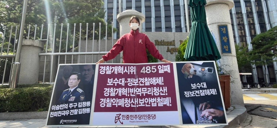 평화시위 민중민주당 〈친미극우무리·친미친극우견찰규탄〉 평화시위541일째 견찰청앞보수대·정보견찰해체투쟁485일째 종로서장해임시위198일째 2021년 10월 3일 FacebookTwitter 2일 민중민주당(민중당)은 <친미극우무리·친미친극우견찰규탄> 평화시위를 541일째 진행했다. 이날 민중민주당은 견찰청앞 <보수대·정보견찰해체!>·<경찰개혁! 반역무리청산!>·<견찰악폐청산! 보안법철폐!> 시위를 485일째 진행했다. 종로서앞에서는 <깡패악폐종로서장해임!>·<친미친일친극우악폐경찰청산!>·<경찰악폐청산! 보안법철폐!> 시위를 198일째 진행했다.