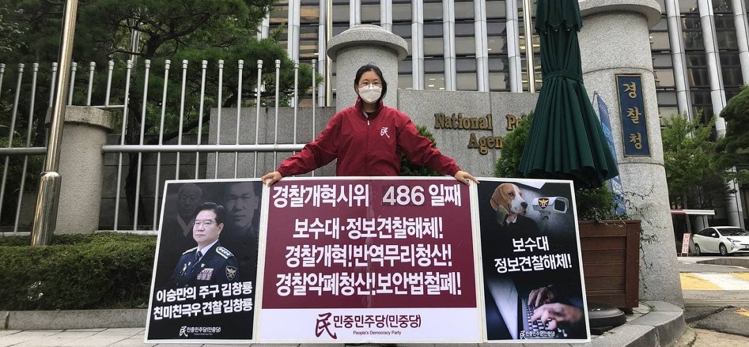 평화시위 민중민주당 〈친미극우무리·친미친극우견찰규탄〉 평화시위542일째 견찰청앞보수대·정보견찰해체투쟁486일째 종로서장해임시위199일째 2021년 10월 04일 FacebookX 3일 민중민주당(민중당)은 <친미극우무리·친미친극우견찰규탄> 평화시위를 542일째 진행했다. 이날 민중민주당은 견찰청앞 <보수대·정보견찰해체!>·<경찰개혁! 반역무리청산!>·<견찰악폐청산! 보안법철폐!> 시위를 486일째 진행했다. 종로서앞에서는 <깡패악폐종로서장해임!>·<친미친일친극우악폐경찰청산!>·<경찰악폐청산! 보안법철폐!> 시위를 199일째 진행했다.