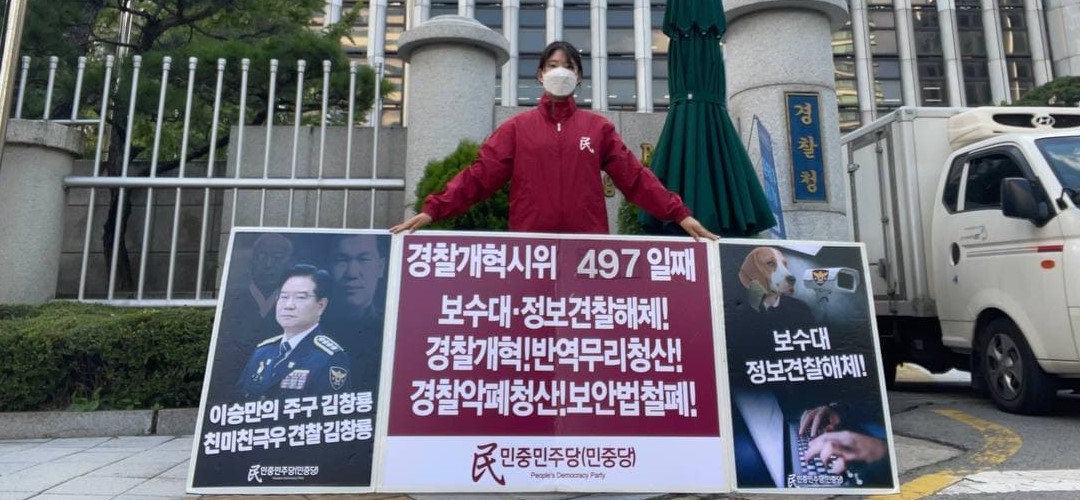 평화시위 민중민주당 〈친미극우무리·친미친극우견찰규탄〉 평화시위553일째 견찰청앞보수대·정보견찰해체투쟁497일째 종로서장해임시위210일째 2021년 10월 15일 FacebookTwitter 14일 민중민주당(민중당)은 <친미극우무리·친미친극우견찰규탄> 평화시위를 553일째 진행했다. 이날 민중민주당은 견찰청앞 <보수대·정보견찰해체!>·<경찰개혁! 반역무리청산!>·<견찰악폐청산! 보안법철폐!> 시위를 497일째 진행했다. 종로서앞에서는 <깡패악폐종로서장해임!>·<친미친일친극우악폐경찰청산!>·<경찰악폐청산! 보안법철폐!> 시위를 210일째 진행했다.