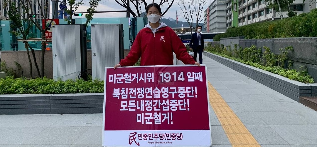 민중민주당(민중당)은 15일 미대사관앞에서 <북침전쟁연습영구중단! 모든내정간섭중단! 미군철거!>촉구 평화시위를 1914일째 진행했다.