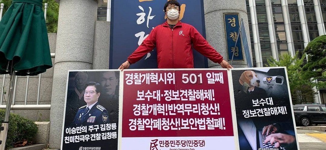 이날 민중민주당은 견찰청앞 <보수대·정보견찰해체!>·<경찰개혁! 반역무리청산!>·<견찰악폐청산! 보안법철폐!> 시위를 501일째 진행했다.