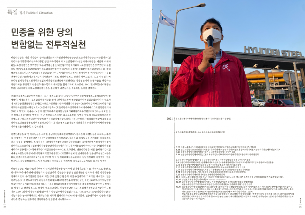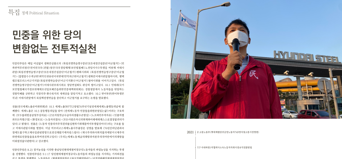 민중민주당은 서울·수도권지역에서 대시민선전활동을 줄기차게 벌여나가고있다. 또 전국적으로 울산·포항·대구·구미·거제·평택·인천등지의 산업단지와 강원양구·횡성·정선일대등을 순회하며 매일 선전활동을 전개하고있다. 추석연휴를 앞두고 서울·경기·인천·강원·충북·대전·부산지역에 가로막을 게시했다. 민중민주당은 9.12 民86호<실업·비정규직철폐!환수복지!민중민주새세상건설!>, 9.23 民87호<RCEP농업말살규탄!투기농지환수!농가부채해소!>, 10.1 民88호<대북적대시정책철회!북침전쟁연습중단!미군철거!>를 발행하고 선전활동으로 각지에 배포하고있다. 민중민주당은 9.2 <북침핵전쟁연습영구중단!미군철거!> 9.19 <실업·비정규직철폐!환수복지!민중민주새세상건설!> 9.27 <RCEP·CPTPP농업말살규탄!투기농지환수!농가부채해소!> 카드뉴스를 제작해 웹사이트와 SNS에 공개했다. 민중민주당이 민중을 위한 당임을 증명하는 전투적인 실천활동은 변함없이 계속될것이다.