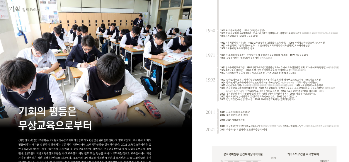 <대한민국>헌법31조①항은 <모든국민은능력에따라균등하게교육을받을권리를가진다>고 밝히고있다. 교육에서 기회의 평등이라는 가치를 실현하기 위해서는 부분적인 지원이 아닌 보편적무상화를 실현해야한다. 2021 교육부소관예산은 총76조4645억원이다. 이중 58조원이 유치원과 초·중등교육분야에, 나머지는 고등교육분야와 평생·직업교육부문에 집행된다. 53조원의 지방교육재정교부금은 시·도교육청의 재원 전부 또는 일부를 국가가 교부하는것으로 교육분야에서 지방자치를 실현하기 위한 재정적수단으로 되고있다. 극소수의 국립학교를 제외한 대부분의 유치원과 초·중·고등학교의 운영에 관한 사무는 시·도교육청이 맡고있다. 시·도교육청은 지방교육세·자체수입·지방채발행등을 활용해 필요한 수입을 확보할수 있다. 2020~21 고등학교무상교육이 단계적으로 시행되면서 2020 6460억원과 2021 9431억원의 예산이 실시됐다. 2020학년도 초·중·고등학교의 학생수는 한학년당 42만~47만명의 분포를 보인다. 2021학년도 고등학교졸업생은 47.6만명이었고 대학입학정원은 47.4만명, 대학입학인원은 43.3만명이었다. 무상교육의 요구가 원만히 실현되려면 교원들의 수준이 질·양적으로 보장돼야한다. 또 무상급식뿐아니라 학생들의 교복과 교재교구비·학용품비등 교육을 위한 일체의 제반비용을 국가가 부담해야한다. 필요한 경우 기숙사가 제공돼야한다. 모든 학생들은 학교안에서 완전히 동등하게 대우받고 완전히 자유롭게 배울수 있어야한다. 초·중등교육의 약20조원에 이르는 사교육시장을 건전화할 필요가 있다. 약30만명의 학원강사들이 있으며 이들사이에 소득차이가 크고 근로조건은 매우 열악하다. 교육전반을 무상화하고 전체노동시장이 개선되는 조건에서 학원강사들의 처우도 개선되겠지만 자유의사에 따라 공교육체계로 흡수하는 방법도 검토할수 있다. 학생들과 강사들의 개인의지에 의한 사교육시장은 불법화되지않는다. 또 고등교육인 대학교육을 합리화하는데서 학교법인들을 정상화하는것이 중요하다. 친일·권력형범죄·사적이윤에 이용된 반민중적학교법인들은 민중들에게 환수돼야한다. 환수된 학교법인들은 국공립교육기관으로 탈바꿈돼 서열화된 대학교육제도를 환골탈태하는데 기여하게 하는것이 중요하다. 반민중적이지않은 학교법인의 운영권은 철저히 보장돼야한다. 취학연령이후에도 교육으로 다양하고 합리적인 취업·전문·평생교육이 마련돼 모든 사람들이 언제라도 교육받을수 있는 권리가 보장돼야한다. 반민중적교육제도하에서 교육받을 권리를 누리지못한 이전세대에게도 교육받을 권리가 무상으로 보장돼야한다.