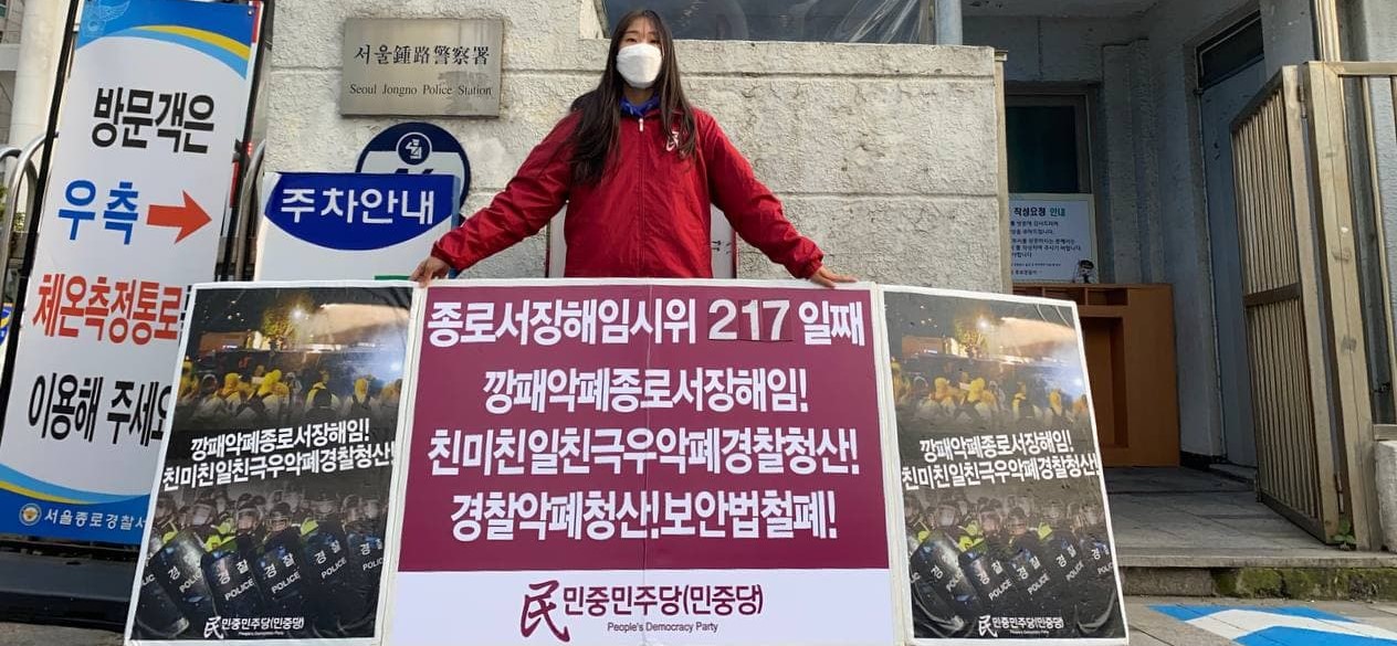 평화시위 민중민주당 〈친미극우무리·친미친극우견찰규탄〉 평화시위560일째 견찰청앞보수대·정보견찰해체투쟁504일째 종로서장해임시위217일째 2021년 10월 23일 FacebookTwitter 21일 민중민주당(민중당)은 <친미극우무리·친미친극우견찰규탄> 평화시위를 560일째 진행했다. 이날 민중민주당은 견찰청앞 <보수대·정보견찰해체!>·<경찰개혁! 반역무리청산!>·<견찰악폐청산! 보안법철폐!> 시위를 504일째 진행했다. 종로서앞에서는 <깡패악폐종로서장해임!>·<친미친일친극우악폐경찰청산!>·<경찰악폐청산! 보안법철폐!> 시위를 217일째 진행했다.