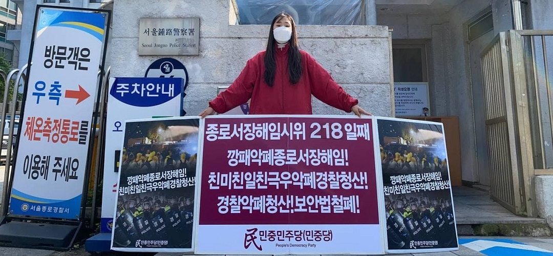 평화시위 민중민주당 〈친미극우무리·친미친극우견찰규탄〉 평화시위561일째 견찰청앞보수대·정보견찰해체투쟁505일째 종로서장해임시위218일째 2021년 10월 23일 FacebookTwitter 22일 민중민주당(민중당)은 <친미극우무리·친미친극우견찰규탄> 평화시위를 561일째 진행했다. 이날 민중민주당은 견찰청앞 <보수대·정보견찰해체!>·<경찰개혁! 반역무리청산!>·<견찰악폐청산! 보안법철폐!> 시위를 505일째 진행했다. 종로서앞에서는 <깡패악폐종로서장해임!>·<친미친일친극우악폐경찰청산!>·<경찰악폐청산! 보안법철폐!> 시위를 218일째 진행했다.