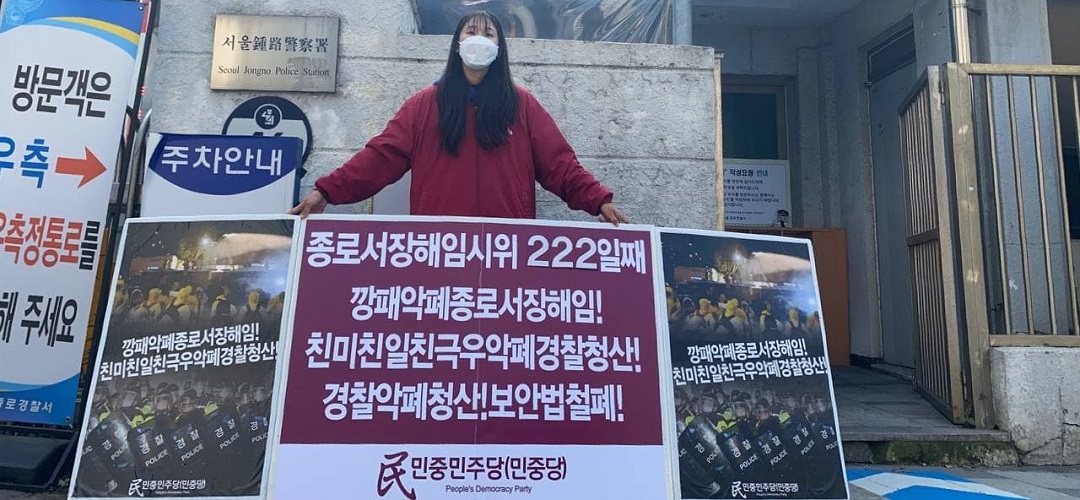 평화시위 민중민주당 〈친미극우무리·친미친극우견찰규탄〉 평화시위565일째 견찰청앞보수대·정보견찰해체투쟁509일째 종로서장해임시위222일째 2021년 10월 27일 FacebookTwitter 26일 민중민주당(민중당)은 <친미극우무리·친미친극우견찰규탄> 평화시위를 565일째 진행했다. 이날 민중민주당은 견찰청앞 <보수대·정보견찰해체!>·<경찰개혁! 반역무리청산!>·<견찰악폐청산! 보안법철폐!> 시위를 509일째 진행했다. 종로서앞에서는 <깡패악폐종로서장해임!>·<친미친일친극우악폐경찰청산!>·<경찰악폐청산! 보안법철폐!> 시위를 222일째 진행했다.