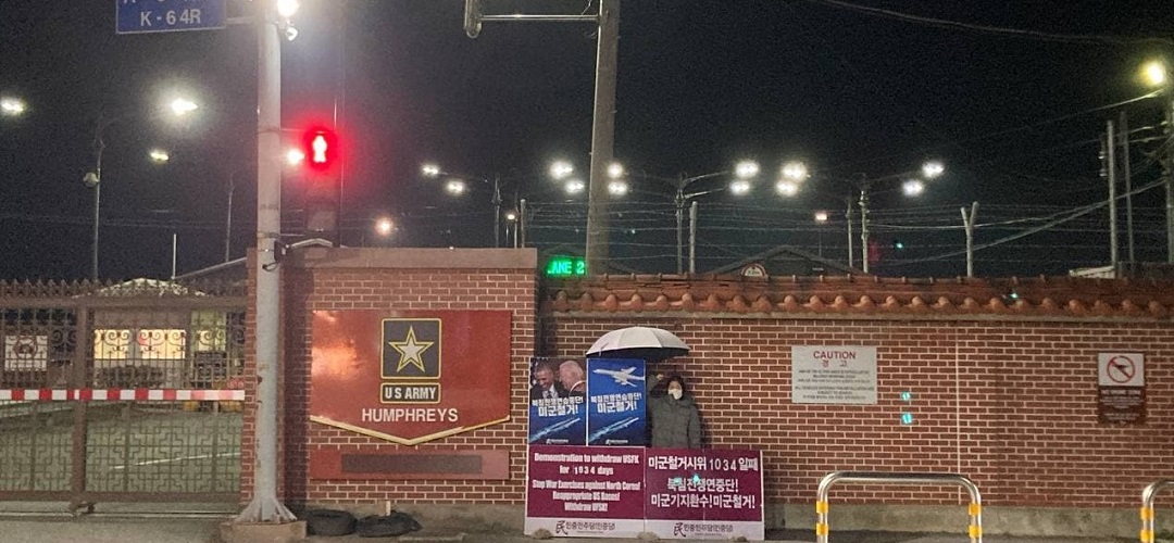 주남미군사령부가 있는 평택험프리스기지앞에서는 <북침전쟁연습중단! 미군기지환수! 미군철거!> 구호피시를 들고 미군철거시위를 1034일째 진행했다.