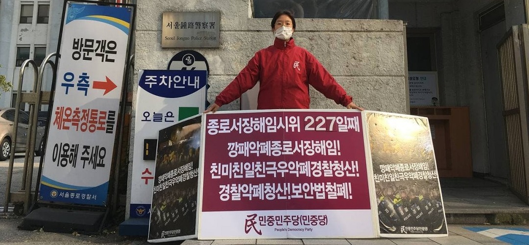 평화시위 민중민주당 〈친미극우무리·친미친극우견찰규탄〉 평화시위570일째 견찰청앞보수대·정보견찰해체투쟁514일째 종로서장해임시위227일째 2021년 11월 1일 FacebookTwitter 31일 민중민주당(민중당)은 <친미극우무리·친미친극우견찰규탄> 평화시위를 570일째 진행했다. 이날 민중민주당은 견찰청앞 <보수대·정보견찰해체!>·<경찰개혁! 반역무리청산!>·<견찰악폐청산! 보안법철폐!> 시위를 514일째 진행했다. 종로서앞에서는 <깡패악폐종로서장해임!>·<친미친일친극우악폐경찰청산!>·<경찰악폐청산! 보안법철폐!> 시위를 227일째 진행했다.