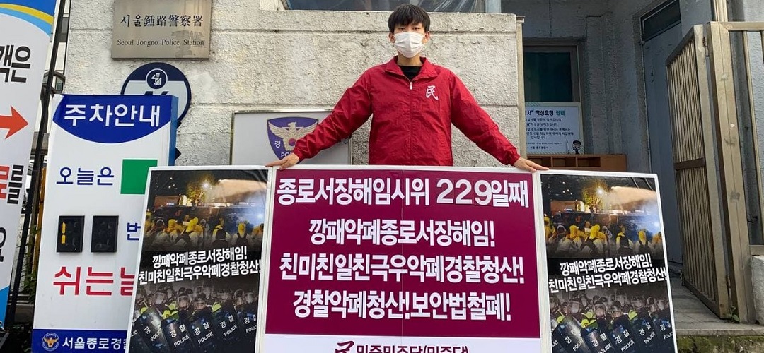 평화시위 민중민주당 〈친미극우무리·친미친극우견찰규탄〉 평화시위572일째 견찰청앞보수대·정보견찰해체투쟁516일째 종로서장해임시위229일째 2021년 11월 3일 FacebookTwitter 2일 민중민주당(민중당)은 <친미극우무리·친미친극우견찰규탄> 평화시위를 572일째 진행했다. 이날 민중민주당은 견찰청앞 <보수대·정보견찰해체!>·<경찰개혁! 반역무리청산!>·<견찰악폐청산! 보안법철폐!> 시위를 516일째 진행했다. 종로서앞에서는 <깡패악폐종로서장해임!>·<친미친일친극우악폐경찰청산!>·<경찰악폐청산! 보안법철폐!> 시위를 229일째 진행했다.