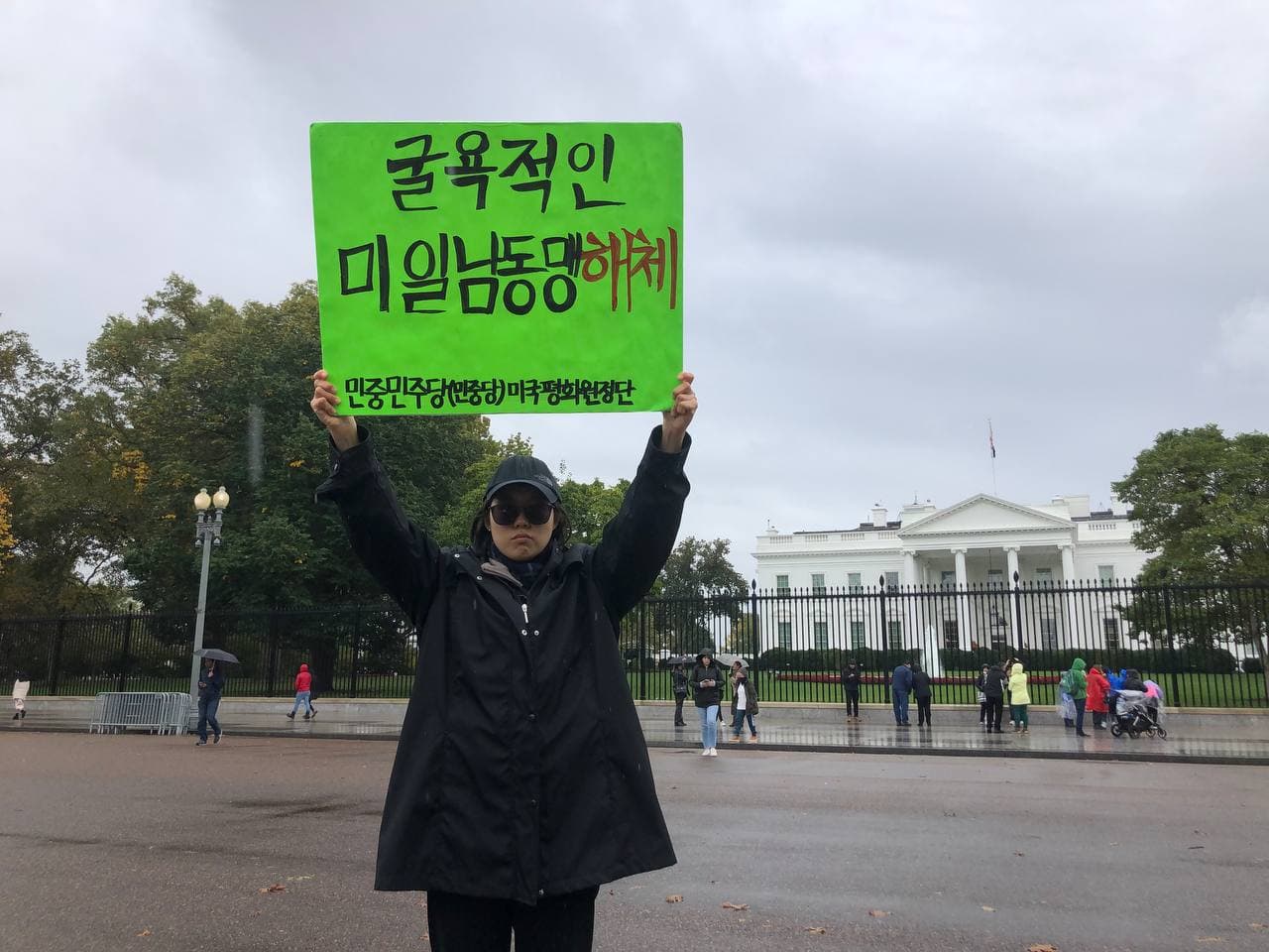 민중민주당(민중당) 미국평화원정단은 2일(현지시간) 워싱턴D.C 백악관앞에서 <제국주의침략군대 미군철거!>, <북침전쟁연습 영구중단!>, <대북적대정책 완전폐기!>, <굴욕적인 미일남동맹 해체!>, <쿠바 내정간섭 즉각 중단!>을 촉구하는 평화시위를 총1628일째 진행했다.