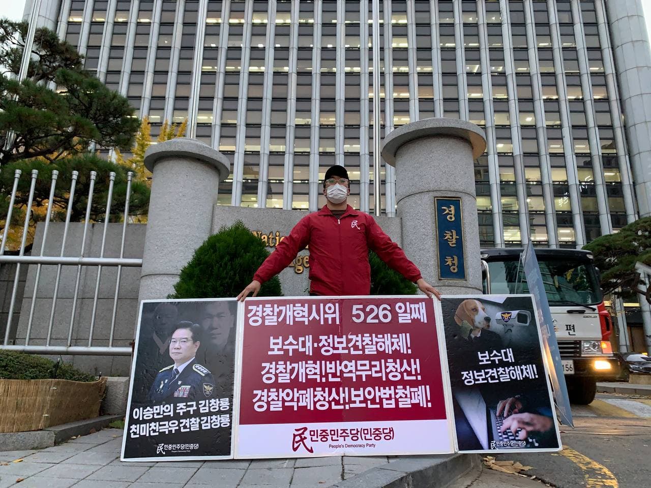 이날 민중민주당은 견찰청앞 <보수대·정보견찰해체!>·<경찰개혁! 반역무리청산!>·<견찰악폐청산! 보안법철폐!> 시위를 526일째 진행했다.