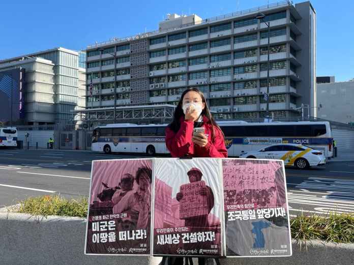 이어 <미군유지비증액반대! 북침전쟁연습영구중단! 미군철거!> 985일째 미대사관포위시위가 전개됐다.