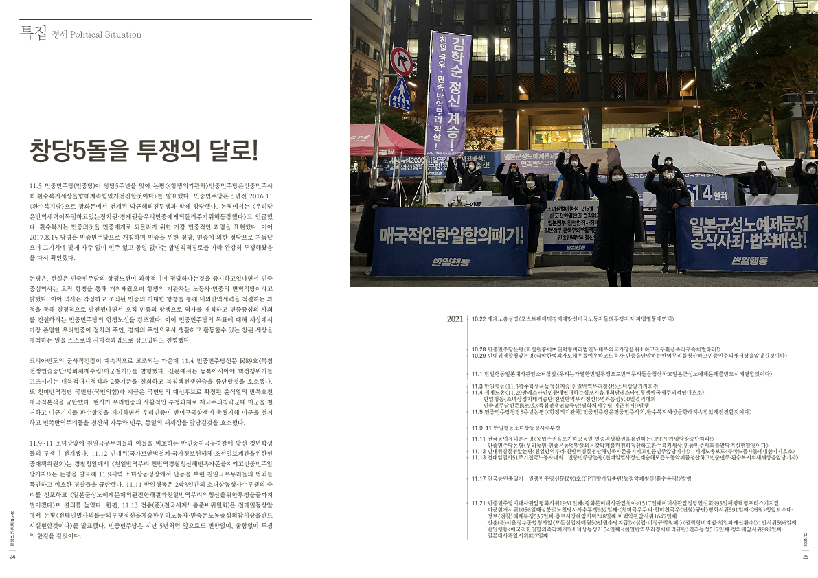 11.9~11 소녀상앞에 친일극우무리들과 이들을 비호하는 반민중친극우경찰에 맞선 청년학생들의 투쟁이 전개됐다. 11.12 민대위(국가보안법철폐·국가정보원해체·조선일보폐간을위한민중대책위원회)는 경찰청앞에서 <친일반역무리·친반역경찰청산해민족자존을지키고민중민주앞당기자!>는 논평을 발표해 11.9새벽 소녀상농성장에서 난동을 부린 친일극우무리들의 범죄를 묵인하고 비호한 경찰들을 규탄했다. 11.11 반일행동은 2박3일간의 소녀상농성사수투쟁의 승리를 선포하고 <일본군성노예제문제의완전한해결과친일반역무리의청산을위한투쟁을끝까지벌이겠다>며 결의를 높였다. 한편, 11.13 전총(준)(전국세계노총준비위원회)은 전태일동상앞에서 논평<전태일열사의불굴의투쟁정신을계승한우리노동자·민중은노동중심의참세상을반드시실현할것이다>를 발표했다. 민중민주당은 지난 5년처럼 앞으로도 변함없이, 굴함없이 투쟁의 한길을 갈것이다.