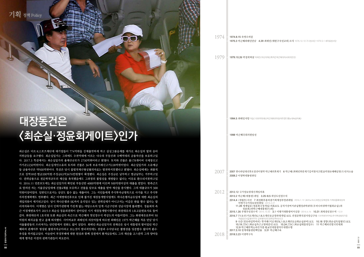 최순실은 미르·K스포츠재단에 대기업들이 774억원을 강제출연하게 하고 삼성그룹승계를 대가로 최순실의 딸의 승마지원금등을 요구했다. 최순실일가는 그외에도 수천억대에 이르는 다수의 부동산과 수백억대의 금융자산을 보유하고있다. 2017.3 특검에서는 최순실일가의 총재산규모가 2730억원이라고 밝혔다. 토지와 건물은 총178개이며 국세청신고가기준2230억원이다. 최순실개인소유의 토지와 건물은 36개 보유거래신고가228억원이었다. 최순실일가의 소유예금등 금융자산은 약500억원이다. 특검은 당시 불법적재산형성혐의자료는 발견하지못했다고 밝혔다. 최순실에게는 최종적으로 징역18년·벌금200억원·추징금63억3676만원형이 확정됐다. 최순실은 추징금은 납부하고 벌금납부는 거부하고있다. 권력남용으로 천문학적규모의 재산을 축적했음에도 그과정의 불법성을 해명할수 없다는 이유로 환수되지못하고있다. 2016.11 언론보도에는 최순실일가의 확인된 부동산만 4000억원에 이르며 500억원이상의 대출을 받았다. 한측근으로 알려진 자는 서울강남일대에 건물4채를 보유하고 건물을 담보로 대출을 받아 재산을 증식했다. 그의 대출규모가 300억원이상이었다. 일반인으로서는 상상도 할수 없는 대출이다. 그는 지인들에게 주식투자금명목으로 사기를 치고 주식투자작전세력에도 연루됐다. 최근 이재명대선후보로 인해 불거진 대장동개발사업에도 하나은행자금유입에 대한 최순실의 개입의혹이 제기되고있다. 당시 하나은행과 SK까지 움직일수 있는 권력실세가 아니고서는 이같은 판을 짤수 없다는 합리적의혹이다. 이재명은 당시 인허가권밖에 가진게 없는 야당소속의 일개 시군구단위 성남시장에 불과했다. 정윤회의 측근 이경재변호사가 2015.9 최순실·정윤회권력이 살아있던 시기 대장동개발시행사인 화천대유의 1호고문변호사로 들어갔다. 화천대유의 1호직원 또한 최순실의 측근으로 박근혜의 첫민정수석 곽상도의 아들이었다. 그는 화천대유로부터 50억원의 퇴직금을 받고 올해 퇴사했다. 사이비교주 최태민의 의붓아들에 따르면 최태민은 1975 박근혜를 처음 만날 당시 서울불광동의 쓰러져가는 단칸방에서 전화도 없이 살았다. 최태민·최순실일가의 전재산은 당시 대통령의 딸이었던 박근혜와의 관계이후 형성된 불법적자금이라고 보는것이 합리적임에도 검찰과 수사당국은 불법성을 입증할수 없다며 환수·추징을 하지않고있다. 이승만이 부정부패에 대한 원성과 함께 정권에서 쫓겨났음에도 그의 재산을 고스란히 그의 양아들에게 챙겨준 이전의 권력기관들이 떠오른다.