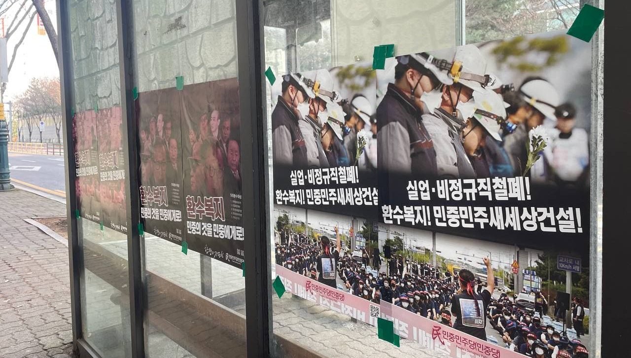 23일 민중민주당(민중당)충남도당은 당진시일대에 <환수복지, 민중의 것을 민중에게로!>, <실업·비정규직철폐! 환수복지! 민중민주새세상건설!> 구호의 포스터를 부착했다.