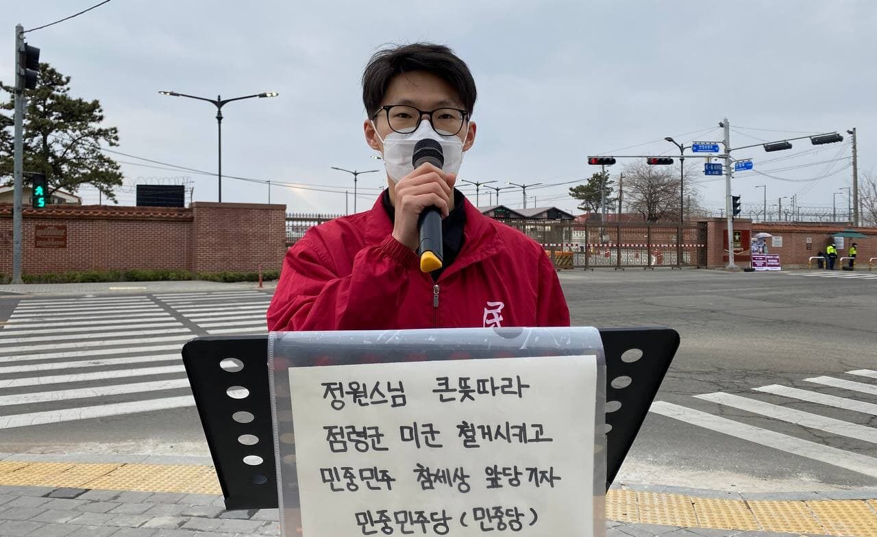 이어 <민중민주당은 2019년주터 오늘로 1104일째 캠프험프리스앞에서 철야시위를 전개하며 친미극우무리들의 방해에도 완강한 미군철거투쟁을 벌이고 있다>며 <정원스님의 투쟁정신을 계승한 민중승리를 향한 첫걸음은 미군철거투쟁이다. 역사는 제국주의세력들의 전쟁책동은 결국 민중의 승리로 끝장난다는걸 보여줬다. 우리민중은 머지않아 미제의 실체에 대해 눈을 뜨게될 것이며 곧 민중항쟁 반미항전으로 거듭날 것이다.>라고 힘주어 말했다.