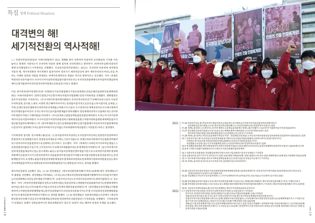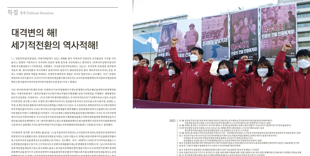 1.1 민중민주당(민중당)은 미대사관앞에서 2022 새해를 맞아 민족자주·민중민주·조국통일의 기치를 더욱 높이고 항쟁의 기관차로서 우리민족·민중과 함께 힘차게 전진하겠다고 밝히면서 <민족자주실현!민중민주쟁취!조국통일완수!>기자회견을 진행했다. 이상훈민중민주당대표는 2022는 우리민족·민중에게 대격변의 격동의 해, 세기적전환의 역사적해가 될것이라며 냉전시기 패권적감상에 젖어 제국주의우두머리노릇을 하려는 미제와 침략과 약탈을 반대하는 반제자주세력간의 대결은 역사의 필연이라고 강조했다. 이어 <전쟁은혁명의또다른이름이다.미국이기어이침략전쟁을벌이겠다면우리는우리민중과함께제국주의침략전쟁을반대해미군철거를외치며전민중적인반미항쟁으로맞설것>이라고 밝혔다.