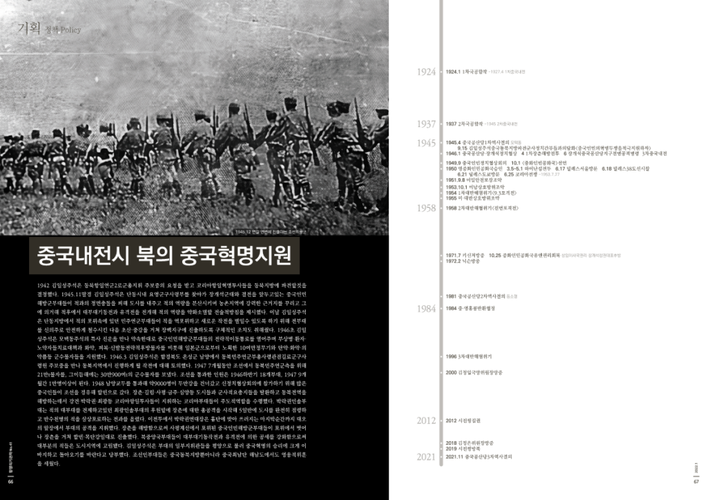 1942 김일성주석은 동북항일연군2로군총지휘 주보중의 요청을 받고 코리아항일혁명투사들을 동북지방에 파견할것을 결정했다. 1945.11말경 김일성주석은 단동시내 요영군구사령부를 찾아가 장개석군대와 결전을 앞두고있는 중국인민해방군부대들이 적과의 정면충돌을 피해 도시를 내주고 적의 역량을 분산시키며 농촌지역에 강력한 근거지를 꾸리고 그에 의거해 적후에서 대부대기동전과 유격전을 전개해 적의 역량을 약화소멸할 전술적방침을 제시했다. 이날 김일성주석은 단동지방에서 적의 포위속에 있던 민주연군부대들이 적을 역포위하고 새로운 작전을 벌일수 있도록 하기 위해 전부대를 신의주로 안전하게 철수시킨 다음 초산·중강을 거쳐 장백지구에 진출하도록 구체적인 조치도 취해줬다. 1946초 김일성주석은 모택동주석의 특사 진운을 만나 약속한대로 중국인민해방군부대들의 전략적이동통로를 열어주며 부상병·환자·노약자들치료대책과 화약, 피복·신발등전략적후방물자를 비롯해 일본군으로부터 노획한 10여만정무기와 탄약·화약·의약품등 군수물자들을 지원했다. 1946.3 김일성주석은 함경북도 온성군 남양에서 동북민주연군부총사령관겸길료군구사령원 주보중을 만나 동북지역에서 진행하게 될 작전에 대해 토의했다. 1947 7개월동안 조선에서 동북민주연군측을 위해 21만t물자를, 그이듬해에는 30만900여t의 군수물자를 보냈다. 조선을 통과한 인원은 1946하반기 18개부대, 1947 9개월간 1만명이상이 된다. 1948 남양교두를 통과해 약9000명이 두만강을 건너갔고 신정치협상회의에 참가하기 위해 많은 중국인들이 조선을 경유해 할빈으로 갔다. 장춘·길림·사평·금주·심양등 도시들과 군사적요충지들을 탈환하고 동북전역을 해방하는데서 강건·박락권·최광등 코리아항일투사들이 지휘하는 코리아부대들이 주도적역할을 수행했다. 박락권인솔부대는 적의 대부대를 견제하고있던 최광인솔부대의 후원밑에 장춘에 대한 총공격을 시작해 5일만에 도시를 완전히 점령하고 만수천명의 적을 살상포로하는 전과를 올렸다. 이전투에서 박락권연대장은 흉탄에 맞아 쓰러지는 마지막순간까지 대오의 앞장에서 부대의 공격을 지휘했다. 장춘을 해방함으로써 사평계선에서 포위된 중국인민해방군부대들이 포위에서 벗어나 장춘을 거쳐 할빈·목단강일대로 진출했다. 북중양국부대들이 대부대기동작전과 유격전에 의한 공세를 강화함으로써 대부분의 적들은 도시지역에 고립됐다. 김일성주석은 부대의 일부지휘관들을 평양으로 불러 중국혁명의 승리에 크게 이바지하고 돌아오기를 바란다고 당부했다. 조선인부대들은 중국동북지방뿐아니라 중국최남단 해남도에서도 영웅적위훈을 세웠다.