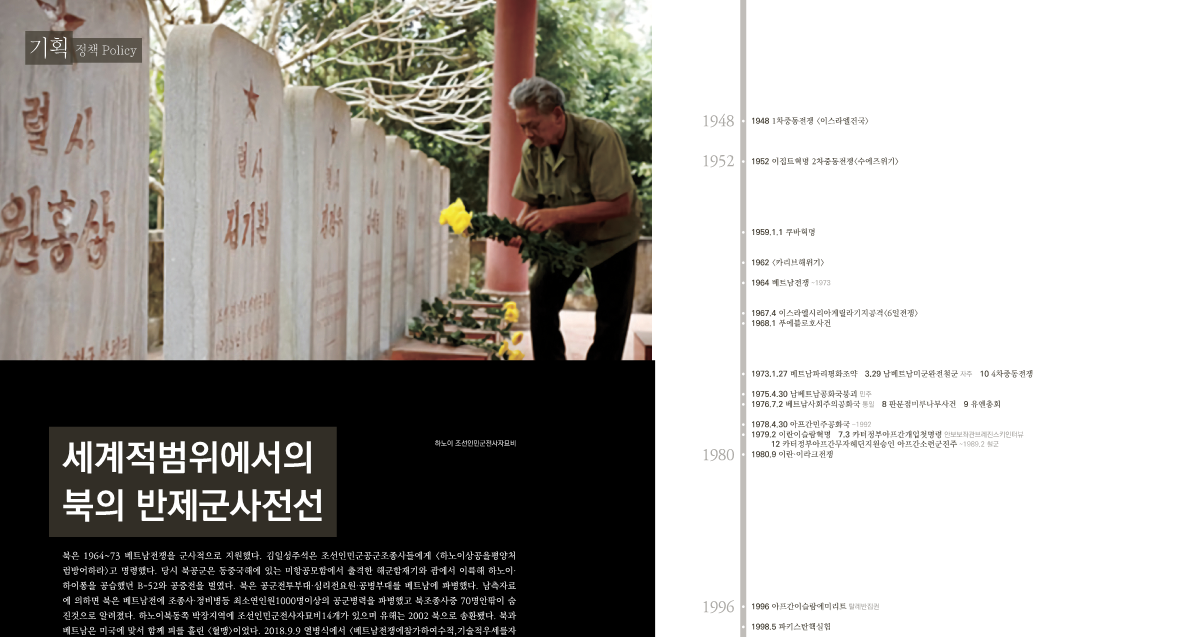 북은 1964~73 베트남전쟁을 군사적으로 지원했다. 김일성주석은 조선인민군공군조종사들에게 <하노이상공을평양처럼방어하라>고 명령했다. 당시 북공군은 동중국해에 있는 미항공모함에서 출격한 해군함재기와 괌에서 이륙해 하노이·하이퐁을 공습했던 B-52와 공중전을 벌였다. 북은 공군전투부대·심리전요원·공병부대를 베트남에 파병했다. 남측자료에 의하면 북은 베트남전에 조종사·정비병등 최소연인원1000명이상의 공군병력을 파병했고 북조종사중 70명안팎이 숨진것으로 알려졌다. 하노이북동쪽 박장지역에 조선인민군전사자묘비14개가 있으며 유해는 2002 북으로 송환됐다. 북과 베트남은 미국에 맞서 함께 피를 흘린 <혈맹>이었다. 2018.9.9 열병식에서 <베트남전쟁에참가하여수적,기술적우세를자랑하던적의공중비적들을무자비하게박살내어조선인민군의본때를남김없이보여준공군종대>라고 소개하기도 했다. 북은 1973 이집트의 이스라엘공격에도 참전해 이집트공군의 우세를 보장하는데 공을 세웠다. 1948 이스라엘이 불법적으로 팔레스타인지역을 차지해 들어오는것을 막지못한 아랍국가들은 1973 북의 지원을 받음으로써 이스라엘에 군사적우세를 보였다. 2011 노동신문보도에 따르면 1973 공중전투에서 북의 전투기들은 F-4 4대를 격추시켰다. 신문에서 당시 상황에 대해 이집트인은 조선의 비행사들은 다른 나라들에서 쓰는 전투방법이 아니라 자기식의 새로운 주체전법으로 적의 비행장·미사일기지·연유창등 주요군사거점들을 연이어 타격하면서 전과를 크게 확대했다고 소개했다. 무바라크이집트대통령은 그에 대한 고마움으로 김일성주석생전에는 남코리아와 수교를 맺지않았다. 북은 1980년대 이란·이라크전쟁에서도 반제반미국가인 이란의 편에서 군사활동을 전개했다. 이란·이라크전쟁때 북장교들이 수천명 참전해 이란혁명수비대의 지휘관으로 전선에 투입됐고 소총·장갑차·자주포·방사포·지뢰·기관총과 스커드미사일, 고속정·잠수정등을 지원했다. 1976 판문점미루나무사건은 당시 조선인민군의 반제반미정치군사적긴장상태에 대해 확인할수 있다.