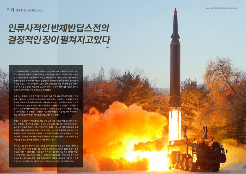 북이 1.5~30 전략적의의가 있는 최신전술무기들발사시험을 연속적으로 전개하고 1.12 노동신문에 <연속공격전>글을 비중있게 발표하며 1.19정치국회의를 열어 향후일정과 전략무기시험재개를 시사한것은 매우 의미심장하다. 지난해 9~10월의 민간·안전무력열병식, 최신무기들시험발사, 국방발전전람회개최를 연발적으로 벌인 일과 겹친다. 한마디로 북은 준비가 완료됐다는 뚜렷한 신호다. 바야흐로 인류사적인 반제반딥스전의 결정적인 장이 펼쳐지고있다. 새로운고조기·발전기가 시작되고있다.