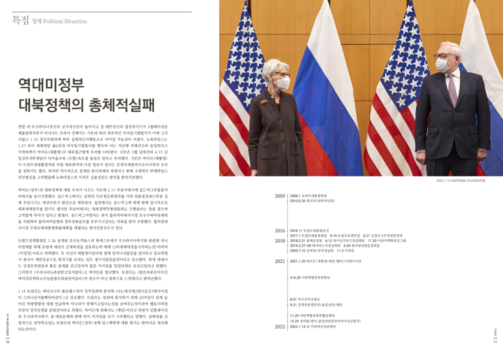 연말 러·우크라이나전선의 군사적긴장이 높아지고 중·대만전선의 결정적시기가 2월베이징동 계올림픽직후가 아니냐는 추측이 강해지는 가운데 북의 연속적인 미사일시험발사가 이에 그치 지않고 1.19 정치국회의에 따라 실제적군사행동으로 이어질 가능성이 커졌다. 뉴욕타임스는 1.27 북이 새해첫달 총6건의 미사일시험발사를 했다며 이는 지난해 전체건수와 동일하다고 지적하면서 바이든<대통령>의 대북접근법에 우려를 나타냈다. 신문은 3월 남대선과 4.15 김 일성주석탄생일이 다가올수록 <도발>속도를 높일수 있다고 우려했다. 신문은 바이든<대통령>이 트럼프전대통령처럼 직접 대북관여에 나설 필요가 있다는 문정인세종연구소이사장의 조언을 전하기도 했다. 하지만 역사적으로 전개된 북미관계의 과정이나 현재 국제적인 반제반딥스전선형성을 고려했을때 뉴욕타임스의 지적은 실효성있는 방안을 밝히지못했다.