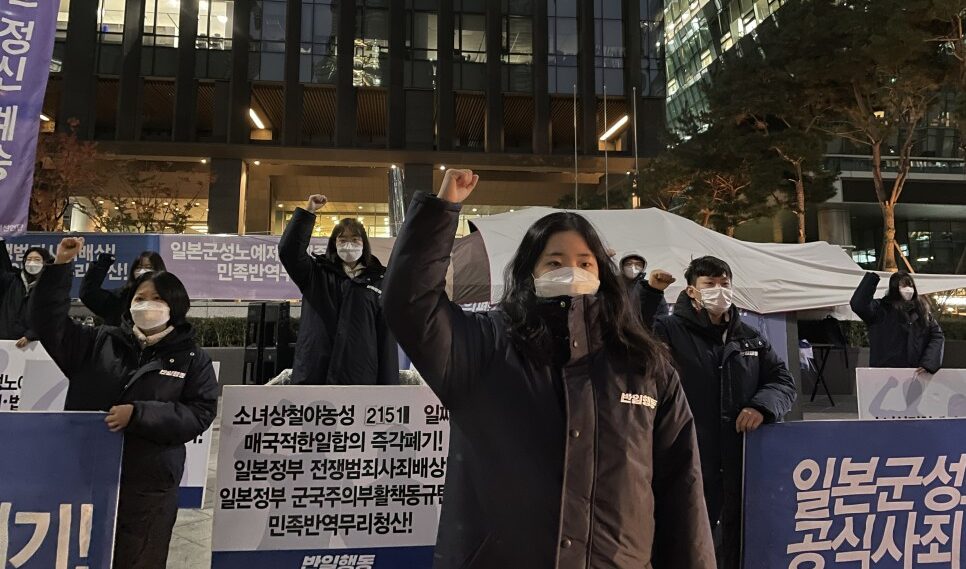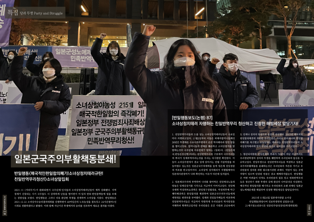 2021.11 <거리두기>가 완화되면서 극우단체·인사들의 소녀상정치테러난동이 재차 강화됐다. 지역정세가 긴장되는 시기 극우들도 더 강력하게 난동을 벌이면서 미·일의 반북·반민중책동에 힘을 보태는 경향성을 보였다. 반일행동은 그러나 더욱 완강한 투쟁을 전개하며 소녀상을 지켰다. 반일행동은 2021.12.22 소녀상사수승리결의대회를 진행하면서 40여일간의 노숙농성을 결속짓고 24시간철야1인시위로 전환하겠다고 밝혔다. 이와 함께 지난기간 투쟁에서의 승리를 선포하며 새로운 결의를 다졌다.