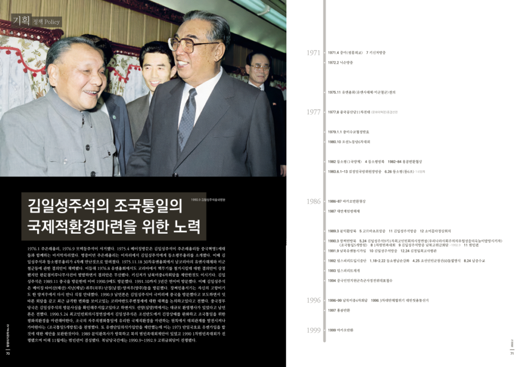 1976.1 주은래총리, 1976.9 모택동주석이 서거했다. 1975.4 베이징방문은 김일성주석이 주은래총리등 중국혁명1세대들과 함께하는 마지막자리였다. 병중이던 주은래총리는 이자리에서 김일성주석에게 등소평부총리를 소개했다. 이때 김일성주석과 등소평부총리가 4차례 만난것으로 알려졌다. 1975.11.18 30차유엔총회에서 남코리아의 유엔사해체와 미군철군등에 관한 결의안이 채택됐다. 이듬해 1976.8 유엔총회에서도 코리아에서 핵무기를 철거시킬데 대한 결의안이 상정됐지만 판문점미루나무사건이 발발하면서 결의안은 무산됐다. 키신저가 남북미중4자회담을 제안한것도 이시기다. 김일성주석은 1989.11 중국을 방문한데 이어 1990.9에도 방문했다. 1991.10까지 3년간 연이어 방문했다. 이때 김일성주석은 베이징·타이산(태산)·지난(제남)·취푸(곡부)·난징(남경)·양저우(양주)등을 방문했다. 장쩌민총서기는 자신의 고향이기도 한 양저우에서 다시 만나 직접 안내했다. 1990.9 남언론은 김일성주석이 극비리에 중국을 방문했다고 보도하면서 잇따른 회담을 갖고 최근 급격한 변화를 보이고있는 코리아반도주변정세에 대한 대책을 논의하고있다고 전했다. 중국정부당국은 김일성주석의 방문사실을 확인해주지않고있다고 하면서도 선양(심양)역에서는 대규모 환영행사가 있었다고 남언론은 전했다. 1990.5.24 최고인민회의시정연설에서 김일성주석은 조선반도에서 긴장상태를 완화하고 조국통일을 위한 평화적환경을 마련해야한다, 조국의 자주적평화통일에 유리한 국제적환경을 마련하는 원칙에서 대외관계를 발전시켜나가야한다는 <조국통일5개방침>을 천명했다. 또 유엔단일의석가입안을 제안했는데 이는 1973 단일국호로 유엔가입을 할것에 대한 제안을 보완한것이다. 1989 문익환목사가 방북하고 북의 범민족대회제안이 있었고 1990 1차범민족대회가 진행됐으며 이해 11월에는 범민련이 결성됐다. 북남당국간에는 1990.9~1992.9 고위급회담이 진행됐다.