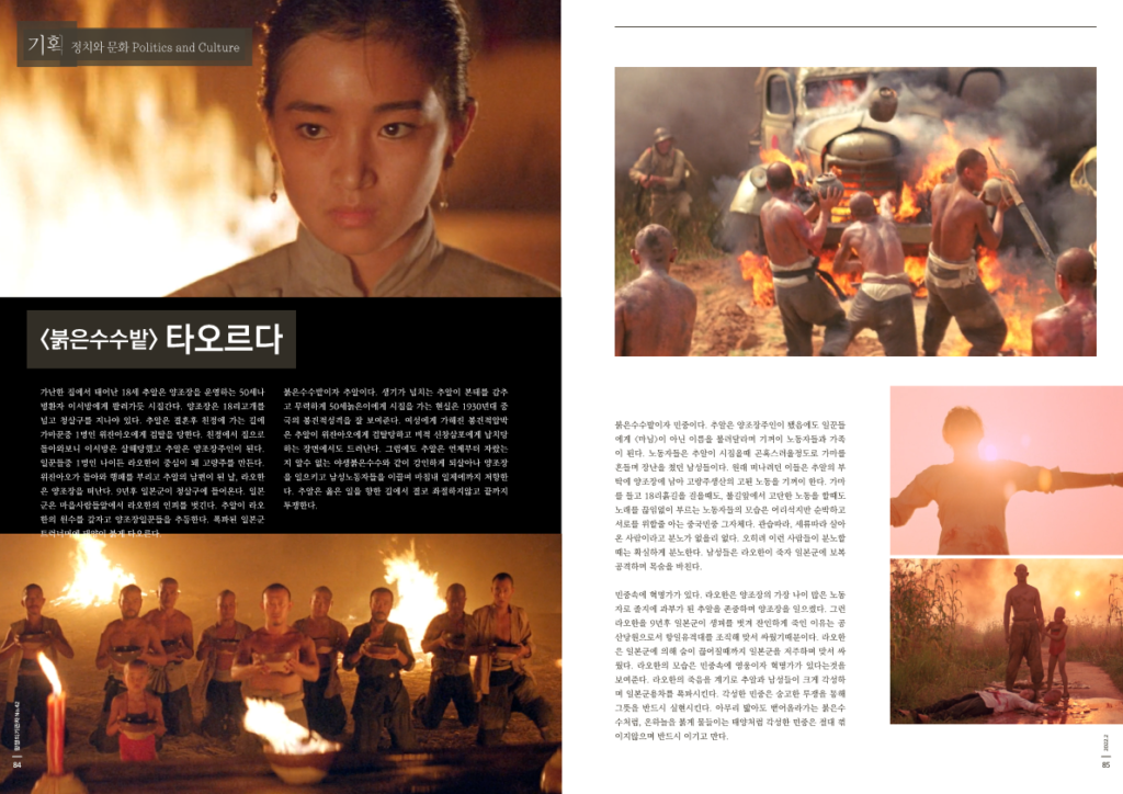 붉은수수밭이자 민중이다. 추알은 양조장주인이 됐음에도 일꾼들에게 <마님>이 아닌 이름을 불러달라며 기꺼이 노동자들과 가족이 된다. 노동자들은 추알이 시집올때 곤혹스러울정도로 가마를 흔들며 장난을 쳤던 남성들이다. 원래 떠나려던 이들은 추알의 부탁에 양조장에 남아 고량주생산의 고된 노동을 기꺼이 한다. 가마를 들고 18리흙길을 걸을때도, 불길앞에서 고단한 노동을 할때도 노래를 끊임없이 부르는 노동자들의 모습은 어리석지만 순박하고 서로를 위할줄 아는 중국민중 그자체다. 관습따라, 세류따라 살아온 사람이라고 분노가 없을리 없다. 오히려 이런 사람들이 분노할때는 확실하게 분노한다. 남성들은 라오한이 죽자 일본군에 보복공격하며 목숨을 바친다.