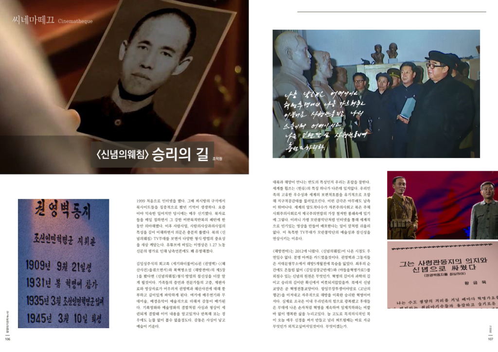 김일성주석의 회고록 <세기와더불어>6권 <권영벽>·<<혜산사건>을겪으면서>와 북혁명소설 <해방전야>의 제3장1을 봤다면 <신념의웨침>형식·방법의 참신성을 더잘 알게 될것이다. 가족들의 증언과 전문가들의 고증, 재판자료와 영상자료가 어우러져 권영벽과 혜산사건에 대해 풍부하고 깊이있게 파악하게 된다. 여기에 배우연기와 무대미술, 배경음악이 예술적으로 더해져 감동이 배가된다. 기록영화와 예술영화의 결합처럼 사실과 형상이 세련되게 결합돼 이미 내용을 알고있거나 반복해 보는 경우에도 눈물 없이 볼수 없을정도다. 감동은 사실이 낳고 예술이 키운다.