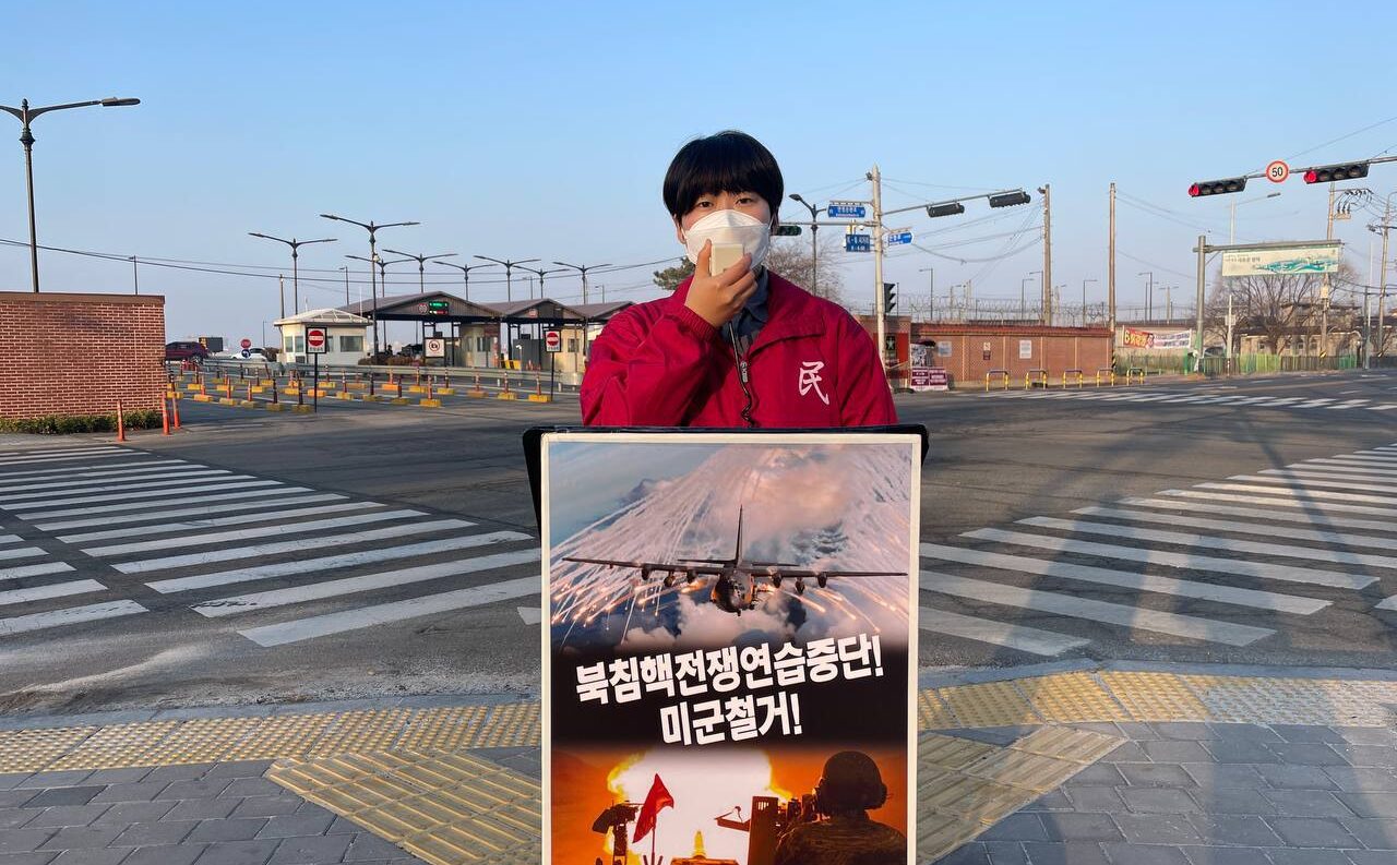 계속해서 <코리아반도에서 70여년간 미국의 동북아패권을 위한 전초기지로서 미군기지 80여곳이 사용되어 왔다. 생화학무기실험까지 벌이는 미군에 한마디 항변하지 못하고 이땅에 혈세를 자진납부하며 동족을 죽이는 전쟁연습까지 같이 하고 있다. 한해 적게는 40회, 많게는 186회까지 북침핵전쟁연습이 벌어지고 있다.>며 <이땅에서 평화정착은 미군철거 없이는 꿈에 불과한 일이다. 바이든<정부>의 비상식적인 전쟁책동은 당장 중단돼야 한다. 우리가 평화를 위해, 생존을 위해, 발전을 위해 해야 할 투쟁은 오로지 미군철거투쟁이다. 평택에서도 거족적인 반미항전으로 함께 일어나 싸워나가자!>고 힘주어 말했다.