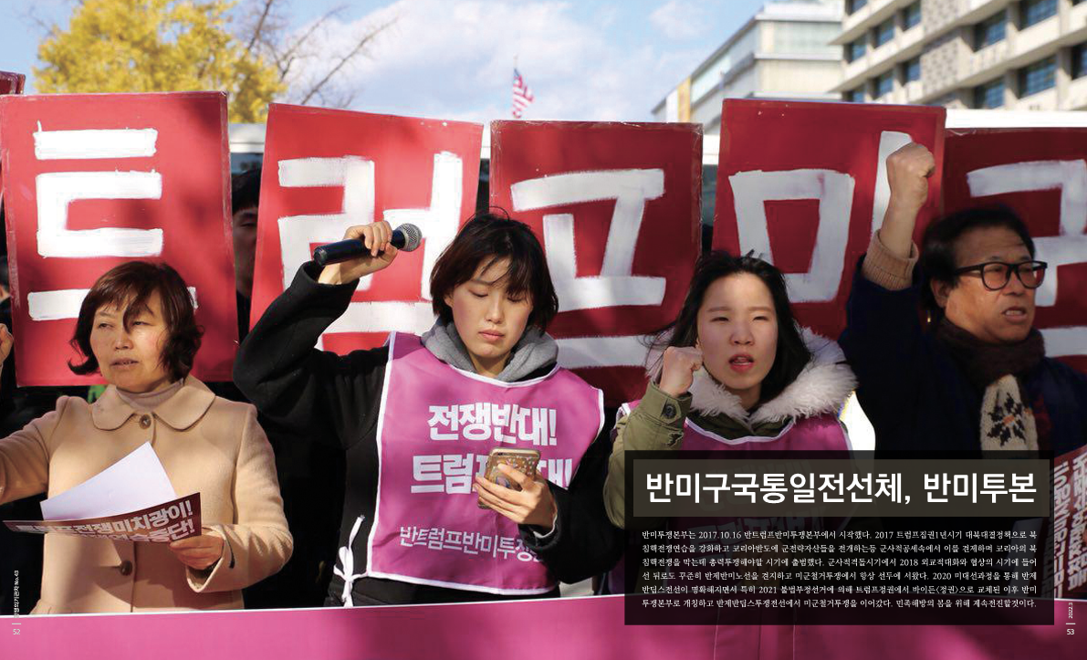 반미투쟁본부는 2017.10.16 반트럼프반미투쟁본부에서 시작했다. 2017 트럼프집권1년시기 대북대결정책으로 북침핵전쟁연습을 강화하고 코리아반도에 군전략자산들을 전개하는등 군사적공세속에서 이를 견제하며 코리아의 북침핵전쟁을 막는데 총력투쟁해야할 시기에 출범했다. 군사적격돌시기에서 2018 외교적대화와 협상의 시기에 들어선 뒤로도 꾸준히 반제반미노선을 견지하고 미군철거투쟁에서 항상 선두에 서왔다. 2020 미대선과정을 통해 반제반딥스전선이 명확해지면서 특히 2021 불법부정선거에 의해 트럼프정권에서 바이든<정권>으로 교체된 이후 반미투쟁본부로 개칭하고 반제반딥스투쟁전선에서 미군철거투쟁을 이어갔다. 민족해방의 봄을 위해 계속전진할것이다.